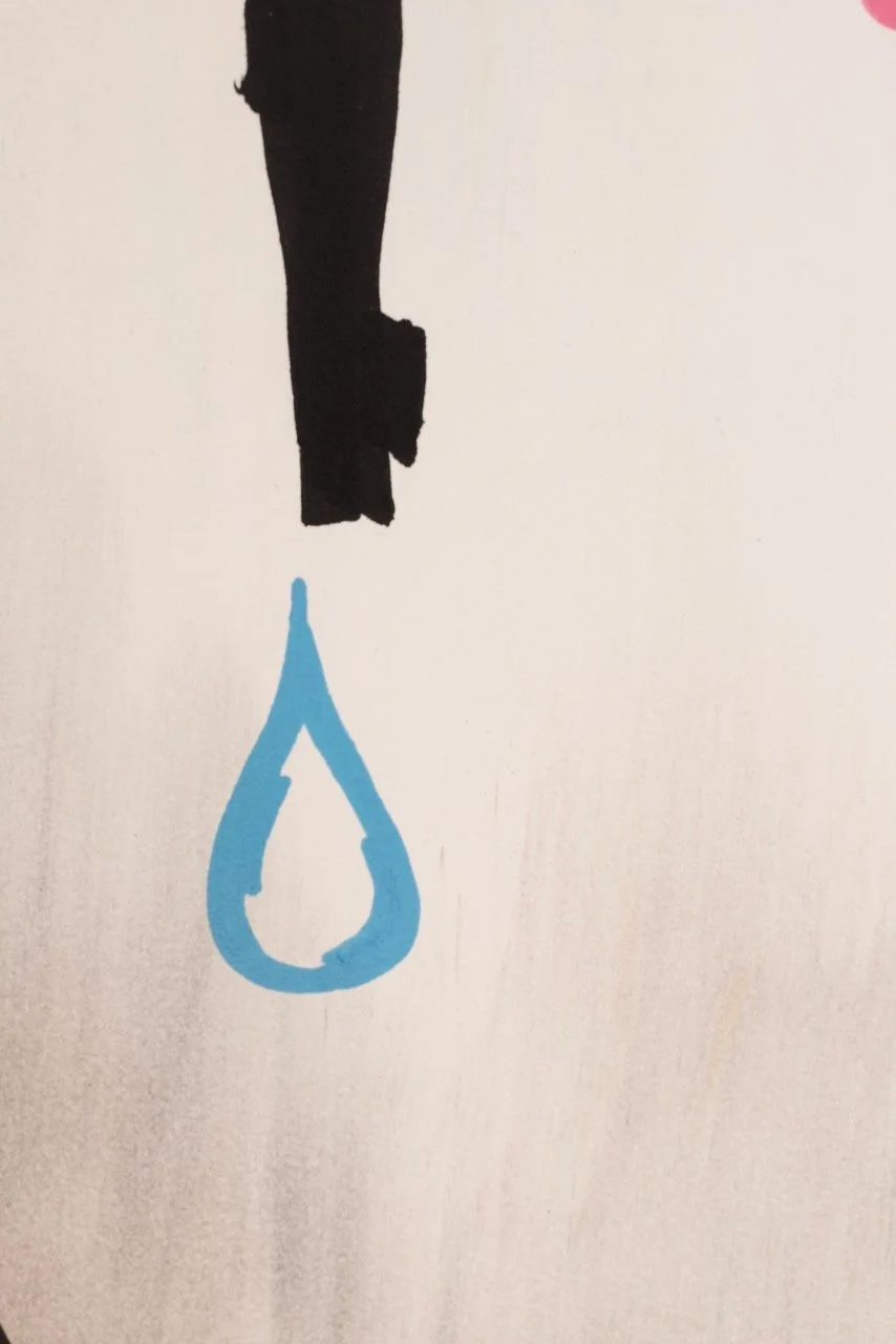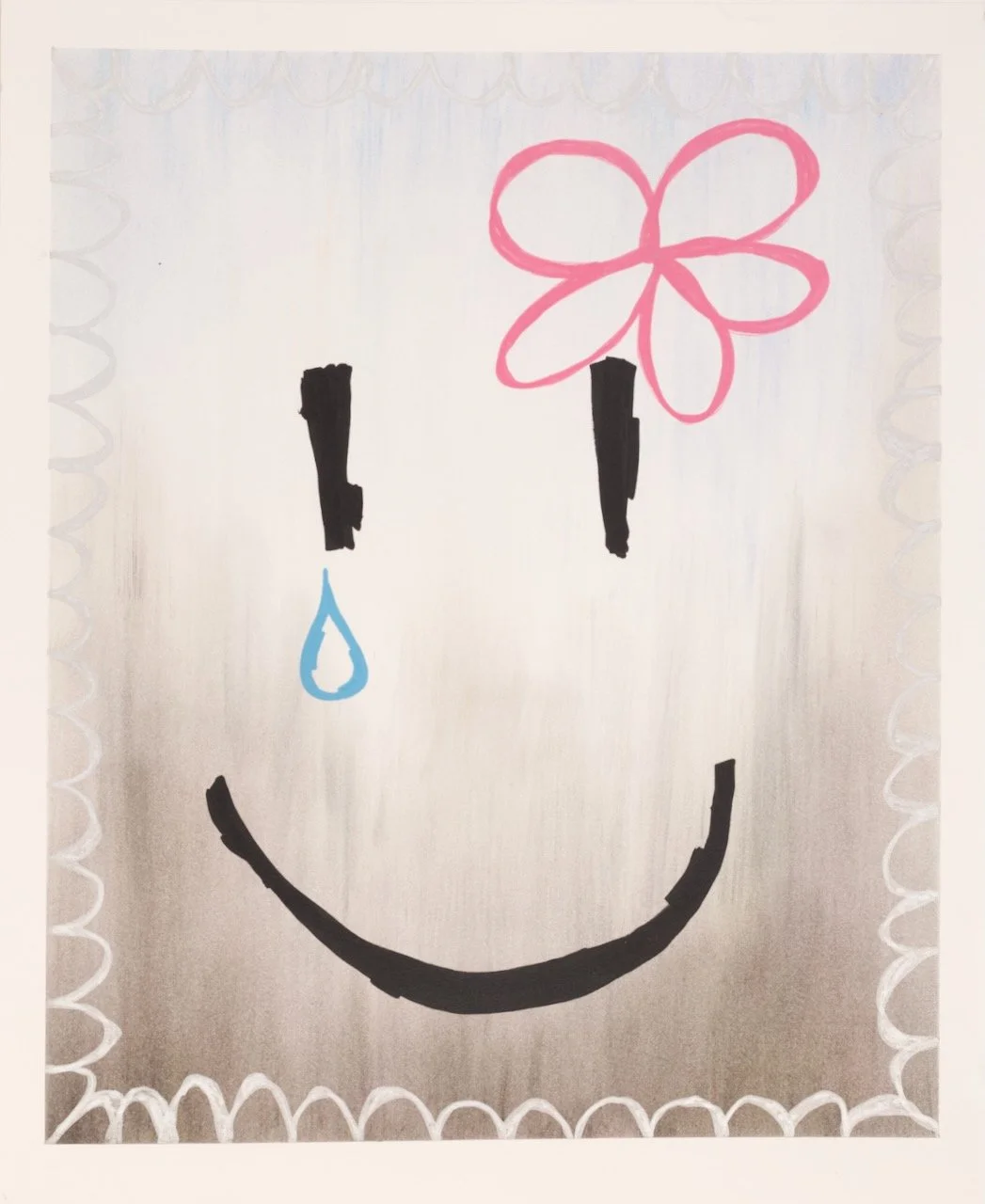 smiley face with a flower and a tear p2 Jun 13 Written By Wolfgang Devine smiley face with a flower and a tear14 X 17mixed media2024 Wolfgang Devine